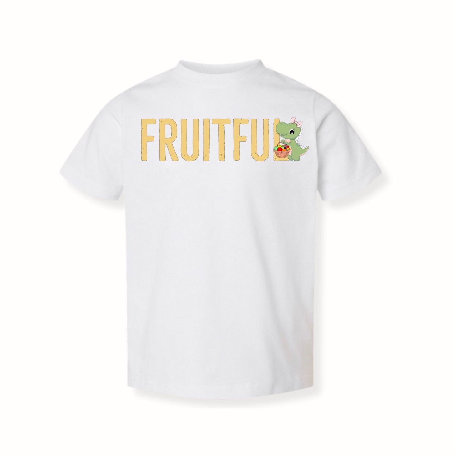 The Fruitful T-shirt is a classic white tee featuring the uplifting word “Fruitful” emblazoned across the front, along with a charming little dinosaur joyfully holding a colorful fruit basket. The teal version of this delightful shirt showcases a boy dinosaur, while the sunny yellow version features a girl dinosaur adorned with a cute bow. Inspired by the powerful message found in John 15:5, this shirt serves as a beautiful reminder of the abundant blessings we receive through Christ, encouraging us to embrace our faith with joy and gratitude.