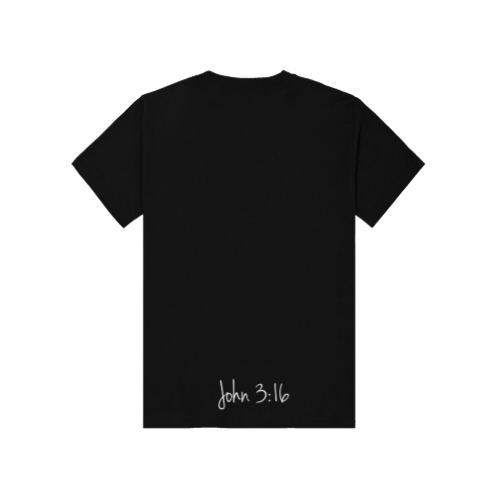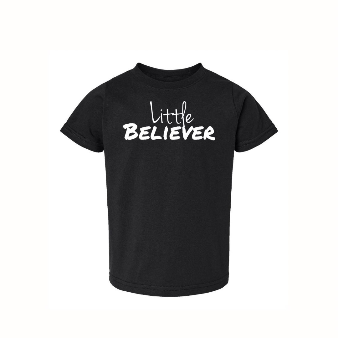 The front of the T-shirt prominently displays the striking words “Little Believer” in bold white letters, catching the eye and conveying a powerful message. On the back of the T-shirt, near the lower hem, the well-known scripture John 3:16 is elegantly written in white, adding a meaningful touch to the design.