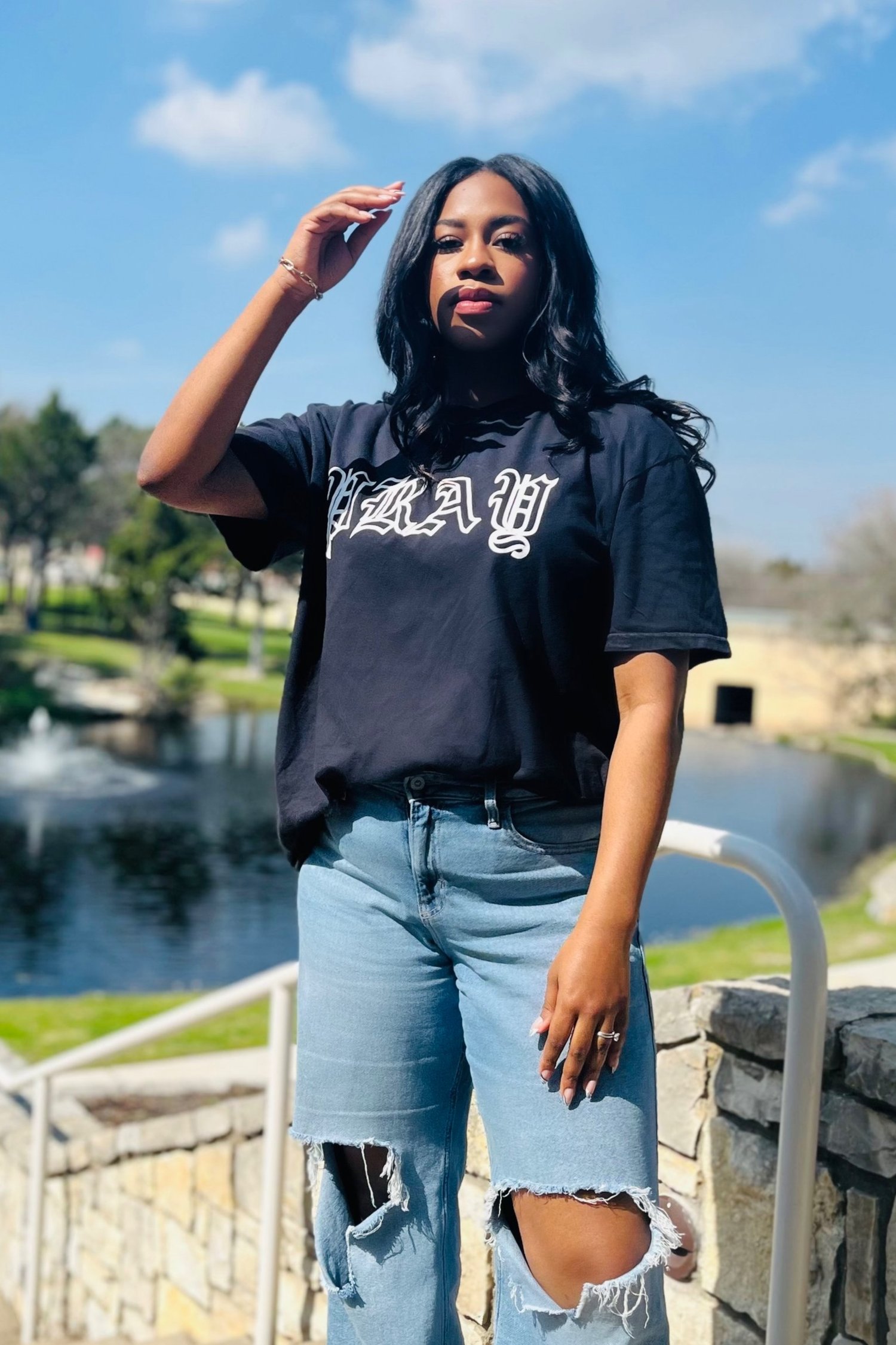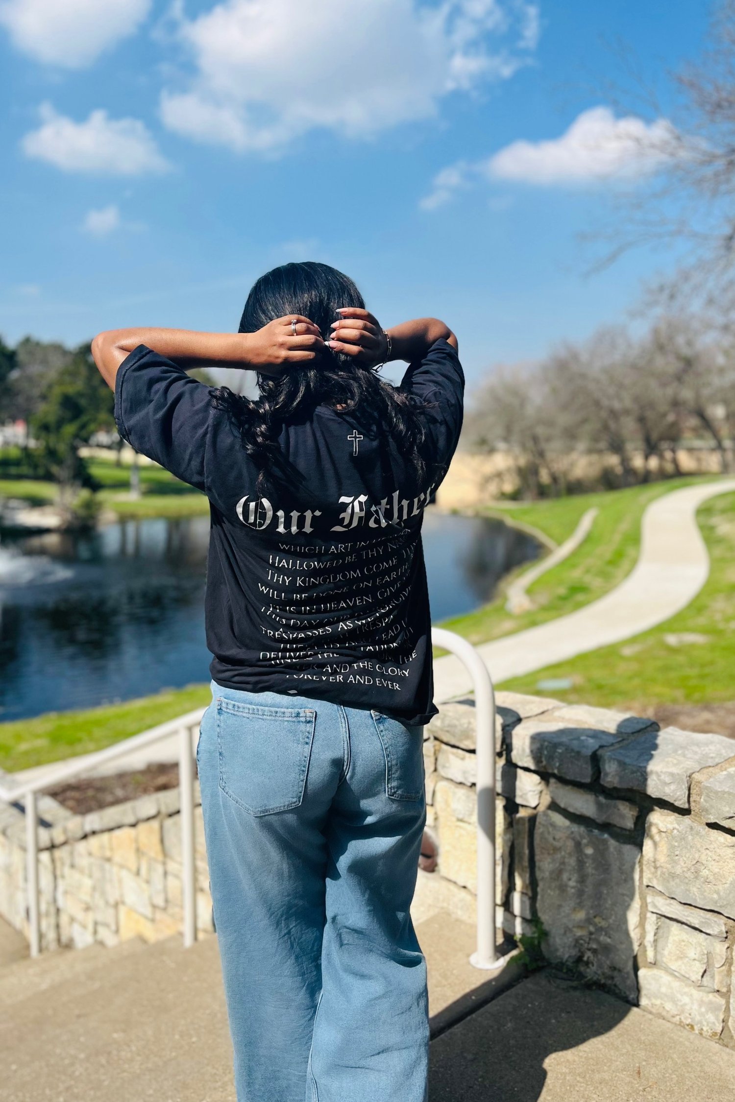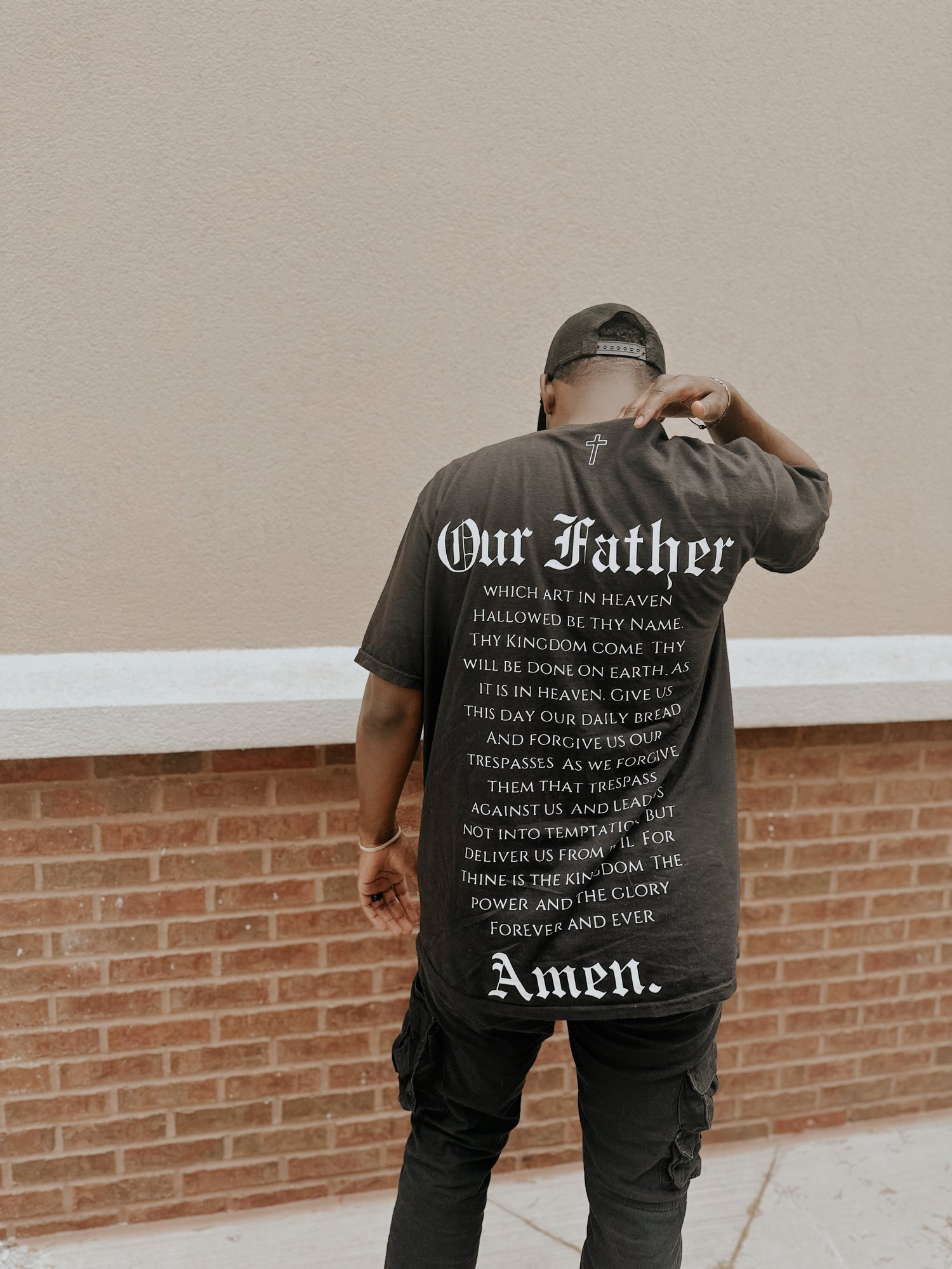 The front of the T-shirt features bold white letters that prominently display the word PRAY. On the back of the shirt, you will find the complete text of The Lord’s Prayer. This sacred prayer begins with the phrase “Our Father,” beautifully positioned at the top, and concludes with the word “Amen” at the bottom, creating a meaningful and spiritual design.