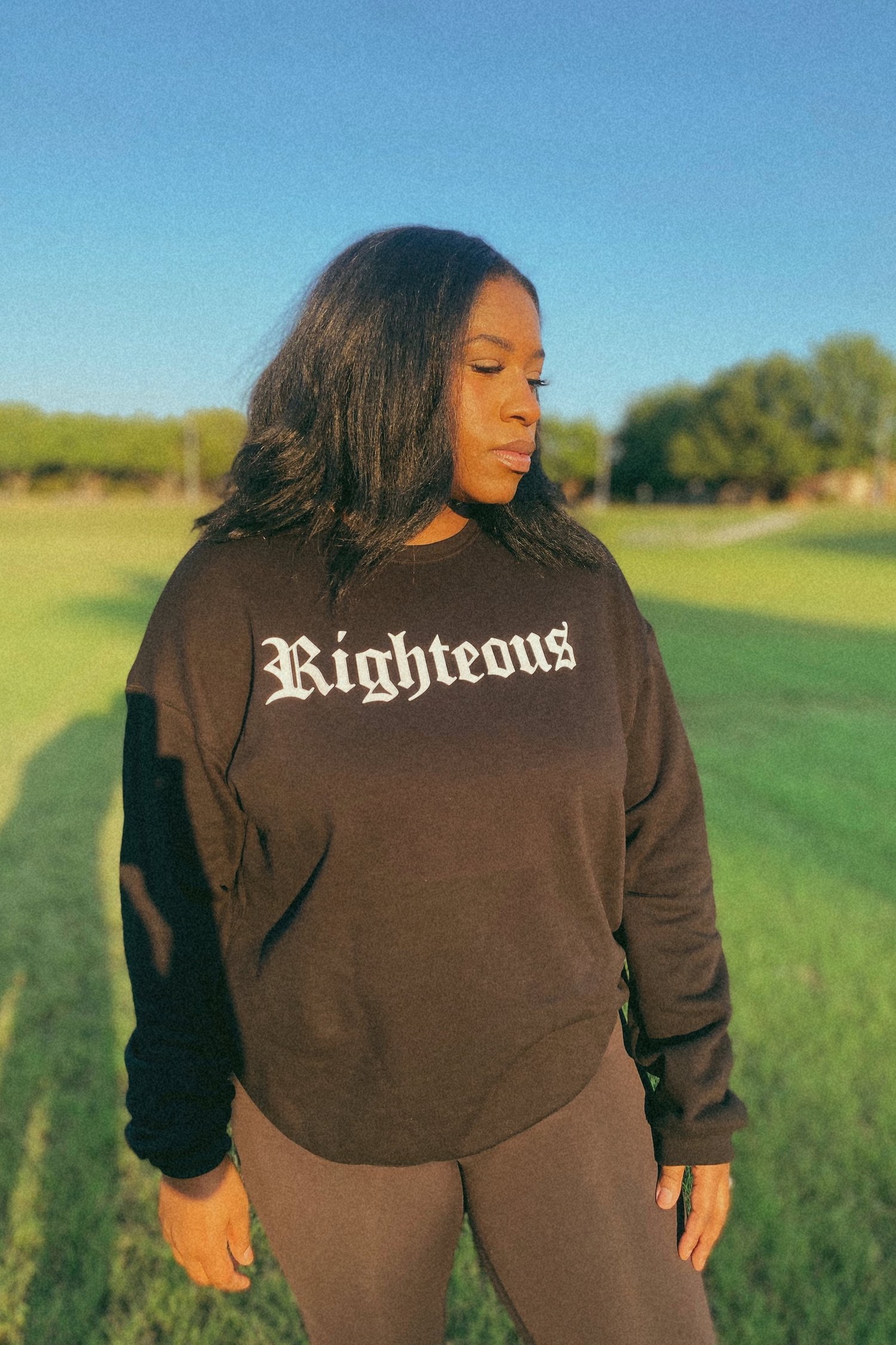 The front of the black sweatshirt prominently displays the word “righteous” in bold white letters that stand out beautifully against the dark fabric. This powerful design draws inspiration from the sweet promise found in Psalm 5:12, which reassures God’s righteous people of His abundant blessings and favor.